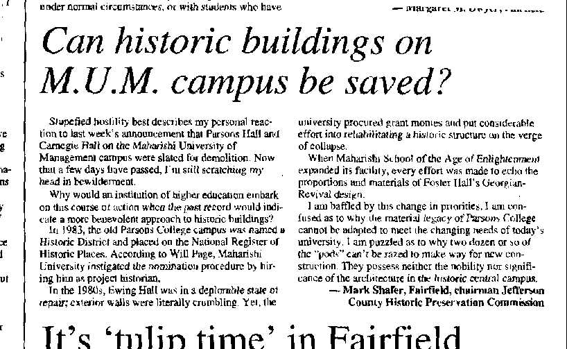 In 1983, the old Parsons College campus was named a Historic District and placed on the National Register of Historic Places. According to Will Page, Maharishi University instigated the nomination procedure by hiring him as project historian.